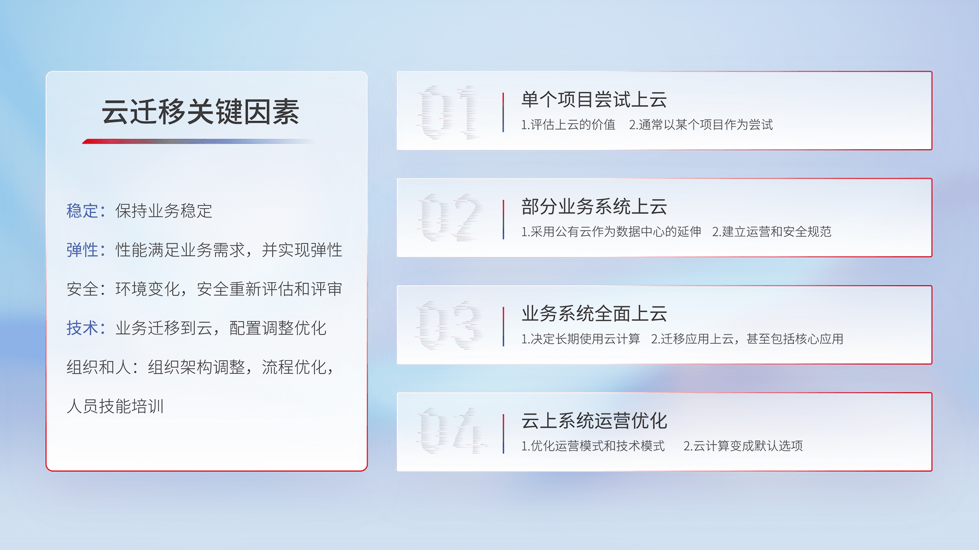结合实际业务,,,,从规划设计、、云平台选型、、、云原生改造、、、、数据迁移、、集成交付,,,迁移全过程为客户识别最佳上云路径,,做好风险识别管理,,,设计网络架构、、身份权限、、安全审计合规、、、操作审计、、日志审计、、、监控告警策略、、多站点容灾设计等,,,对云上基础设施进行整体规划,,提升IT治理水平,,,以满足弹性、、、、高可用、、、高性能的需求。。。。