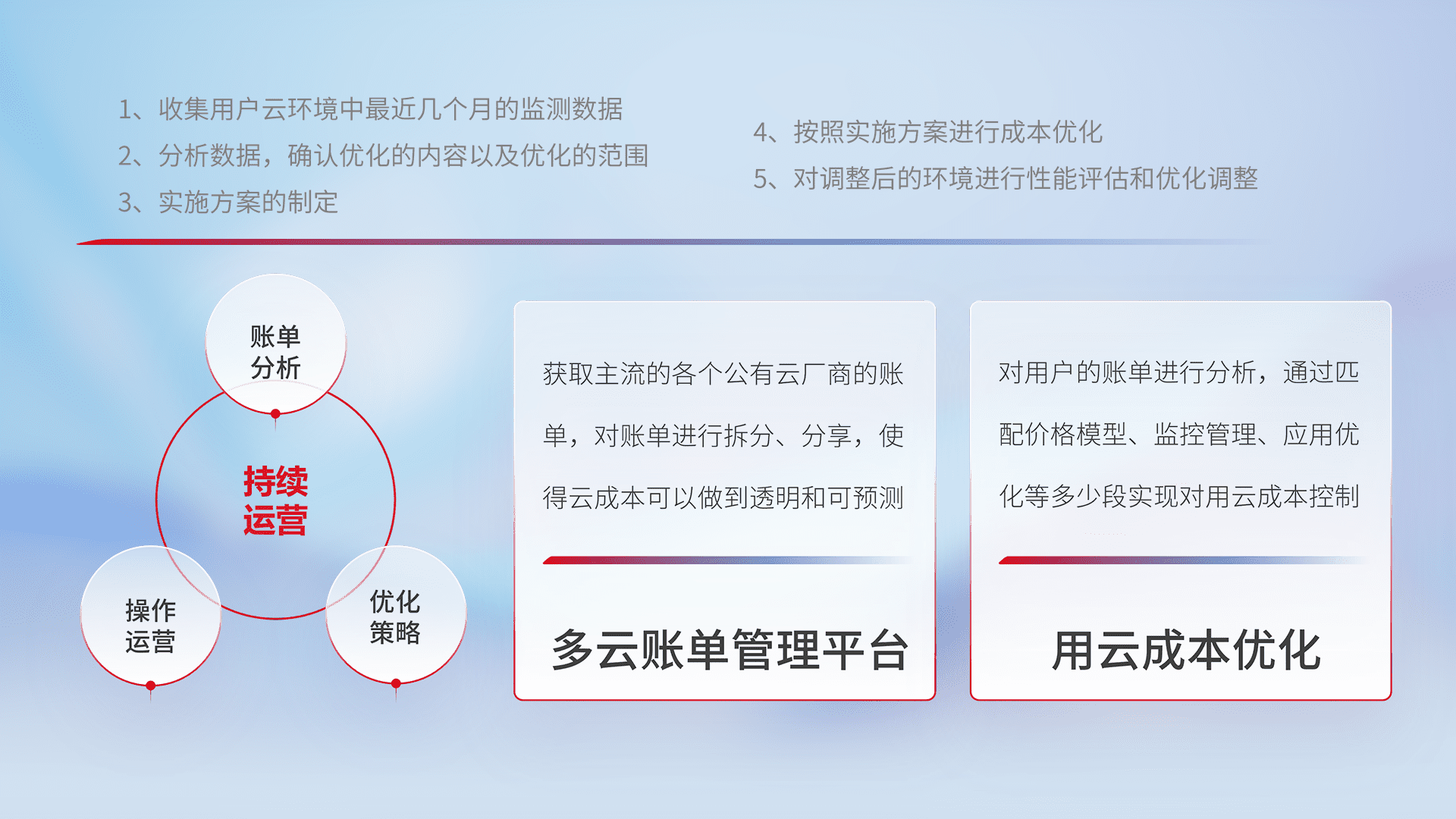 通过多云纳管,,,以统一的资源数据模型把客户的云资源进行抽象和封装,,,进而实现对多云资源的统一操作,,,保障云资源管理的可靠性、、、、稳定性与可用性。。量身定制化运维内容,,,,配置、、、、开发运维、、、补丁管理、、、备份、、、监控、、、认证和访问管理、、审计和日常巡检等,,保障在用云过程中的可靠度,,稳定度以及高可用率。。。。